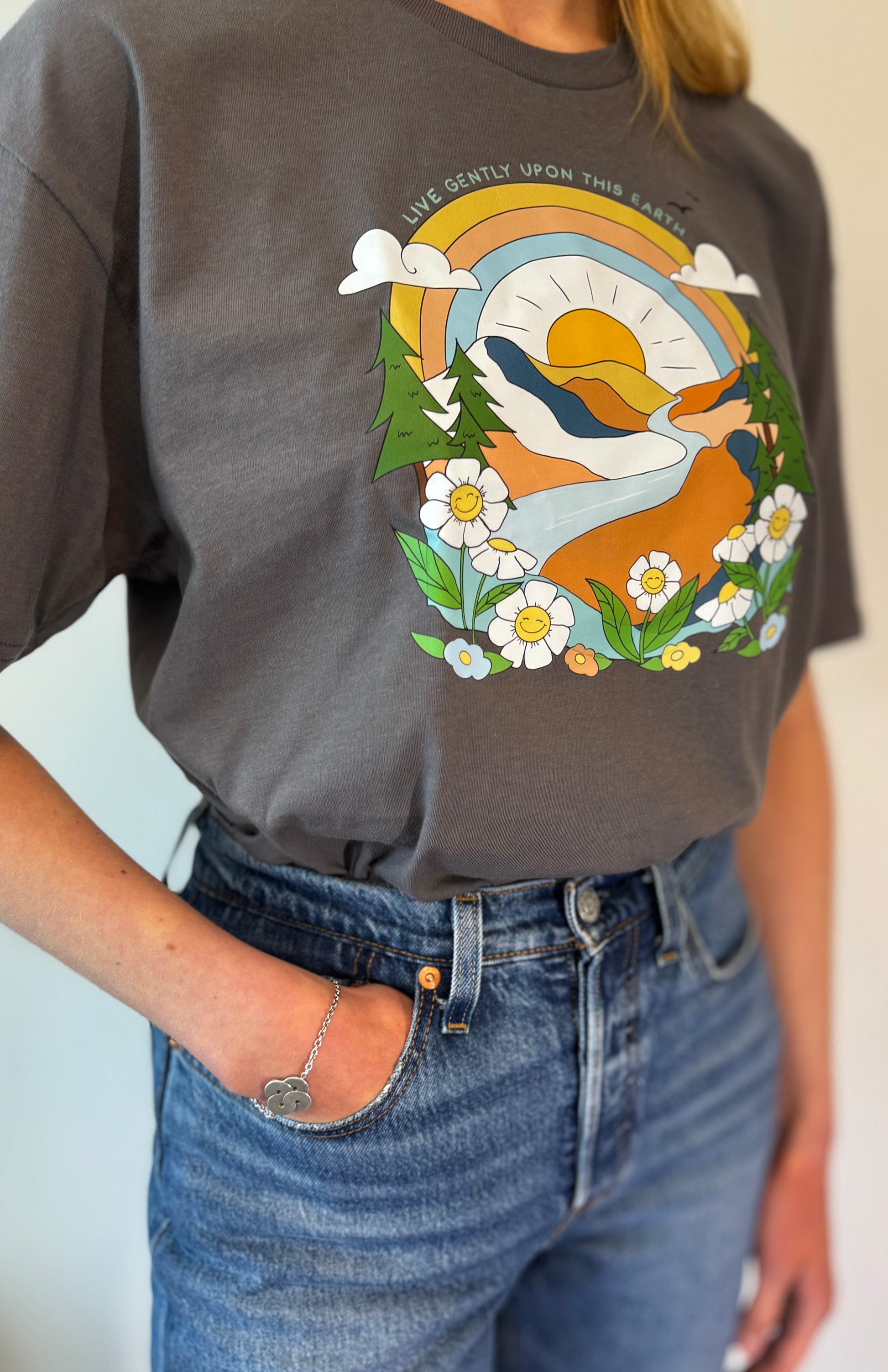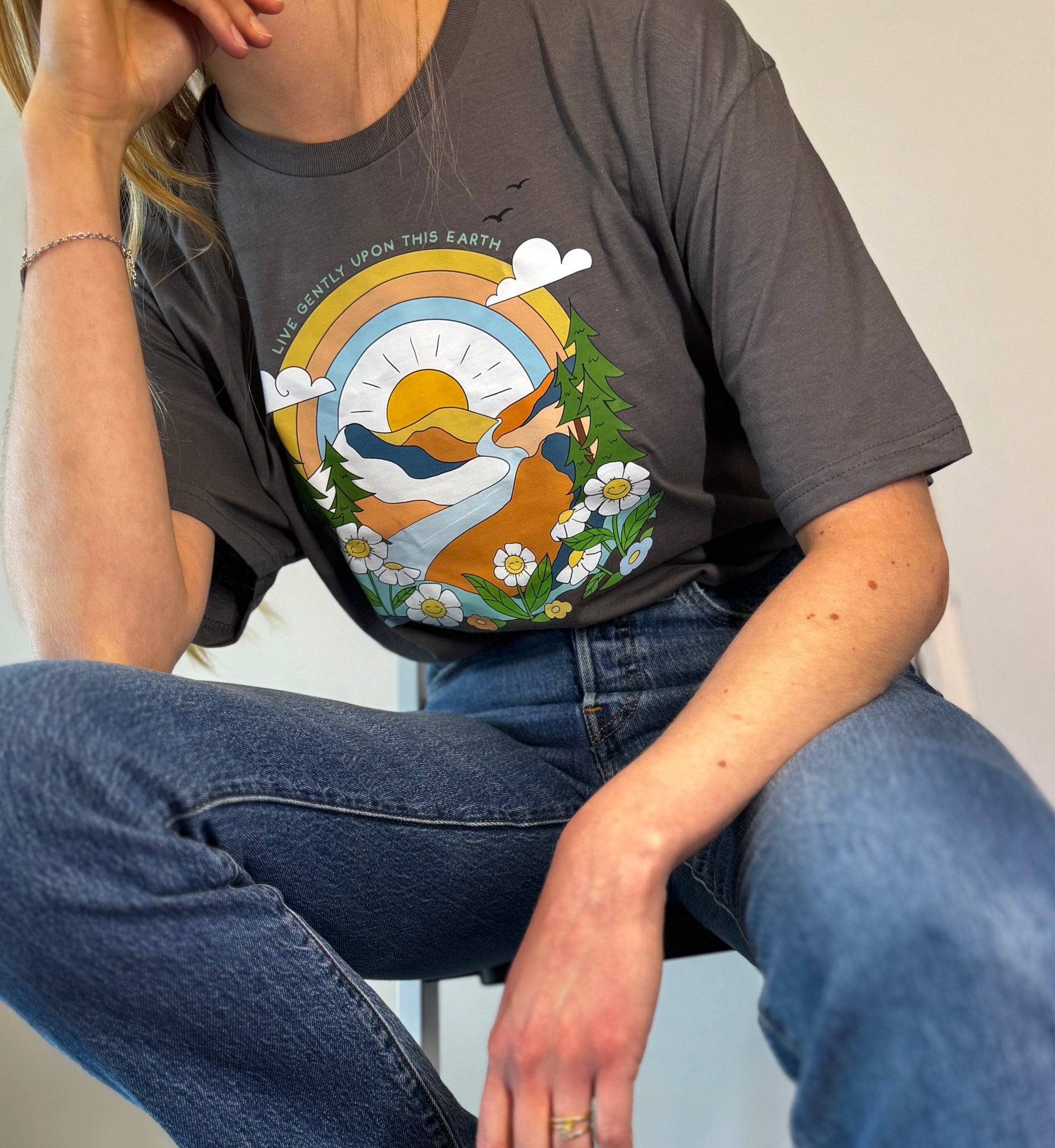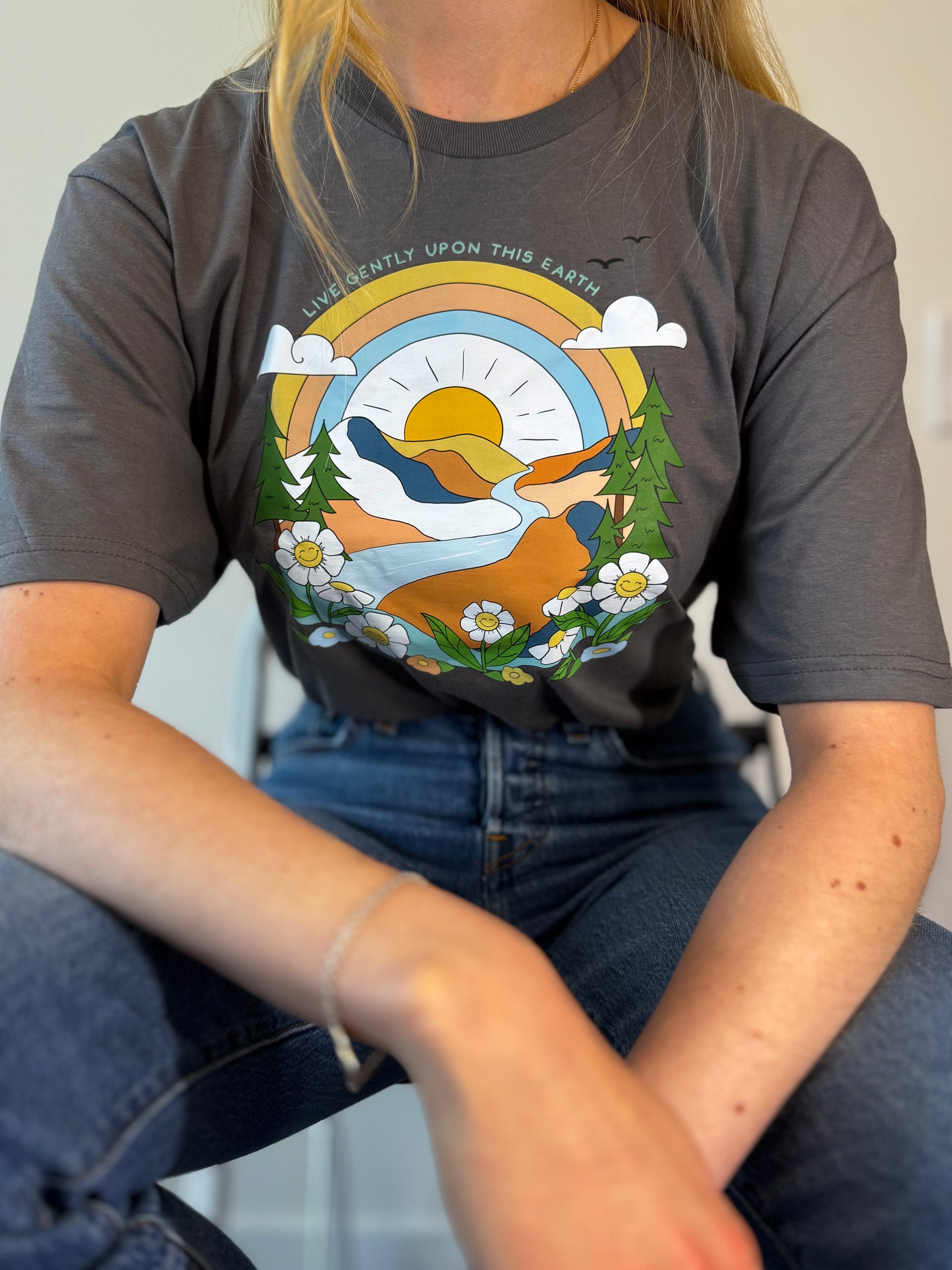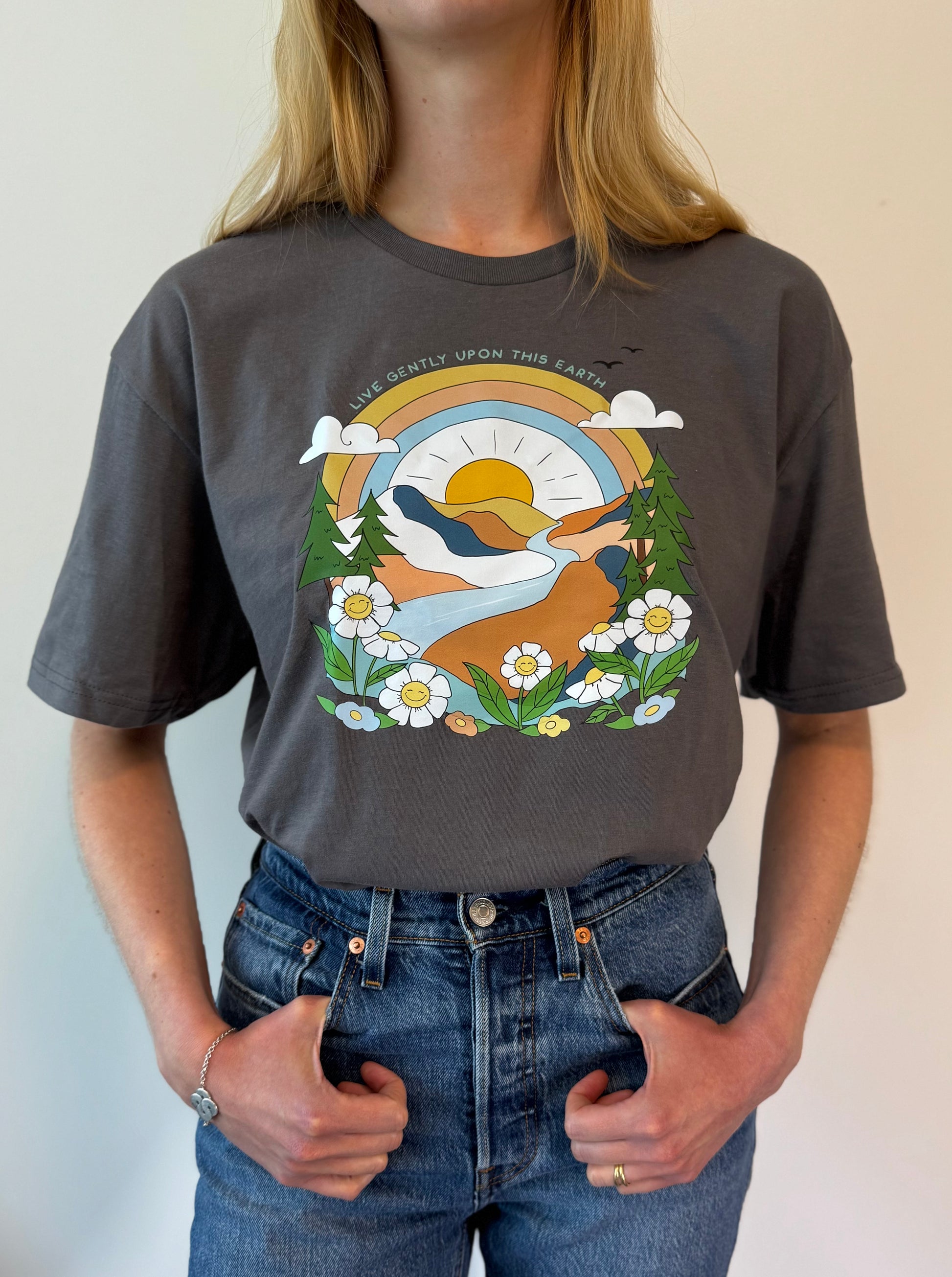 This lovely charcoal t-shirt isn't just comfy; it carries a powerful and gentle sentiment! With "Live Gently Upon This Earth" beautifully displayed, it's a stylish way to express your commitment to mindfulness and compassion for our planet. Wear it and inspire good vibes wherever you go.